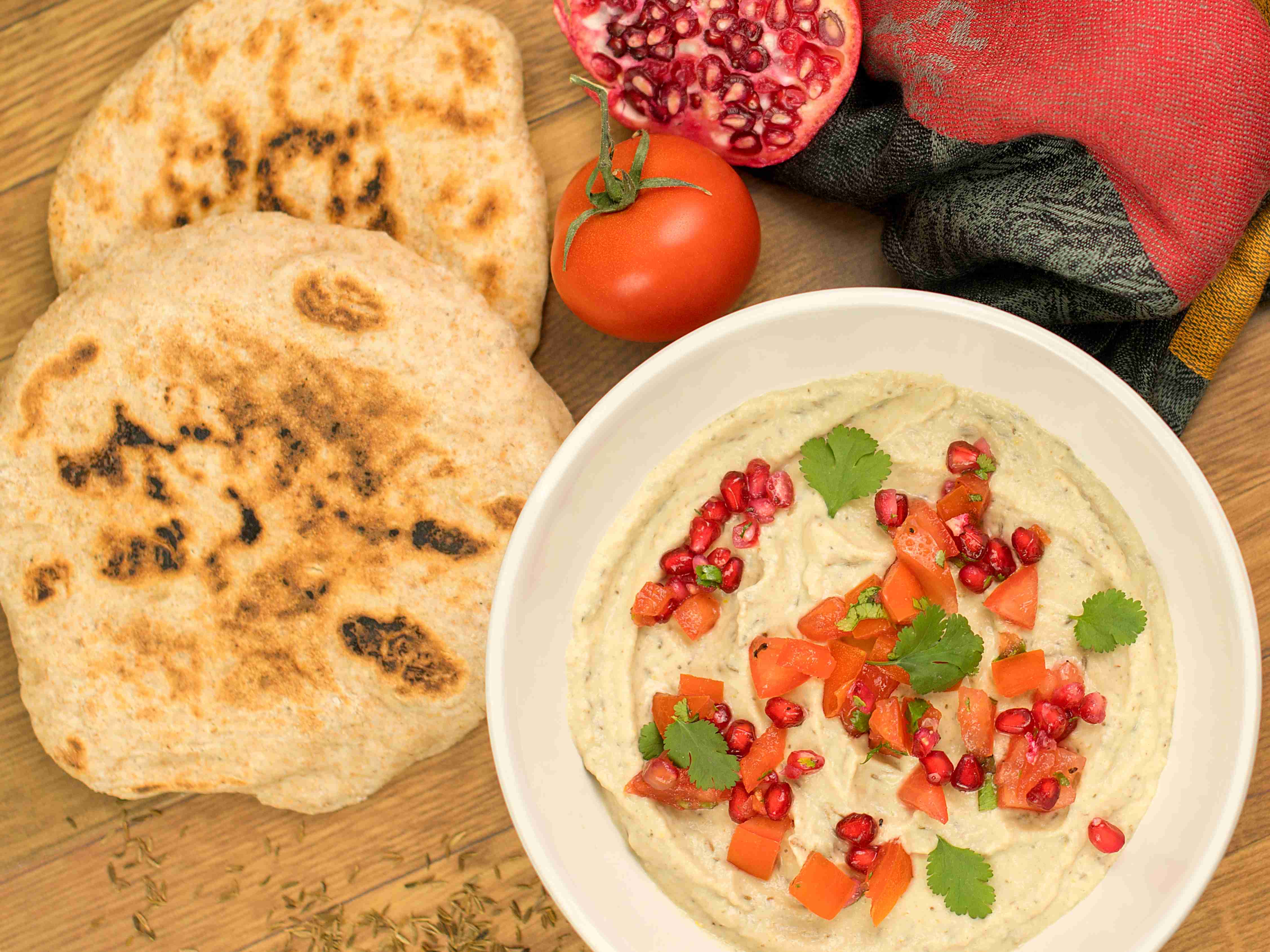 Vylepšíme ho ešte paradajkami, granátovým jablkom a koriandrom. Začneme paradajkami, ktoré zbavíme jadierok. Následne ich nakrájame na kocky, ku ktorým pridáme nasekaný koriander a zrniečka granátového jablka. Všetko spolu premiešame a takto pripravenou zmesou posypeme  Moutabal. Moutabal je ideálne podávať s Pita chlebom.